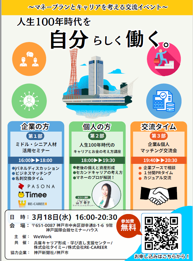 | 第2部 | 個人の方 | 18:00〜19:30 | 人生100年時代のキャリアとお金の考え方講座(山下幸子 FP 登壇) |