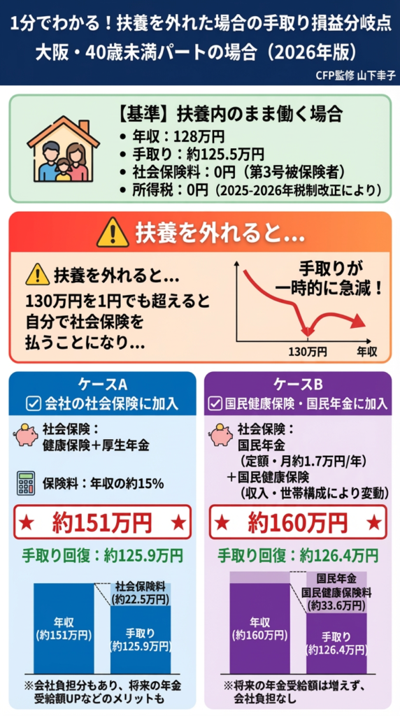 「扶養を外れると損をする」という誤解を解くため、社会保険(協会けんぽ大阪支部 2026年度見込み)と国民健康保険(大阪市)の違いと、手取りの分岐点を示します。
