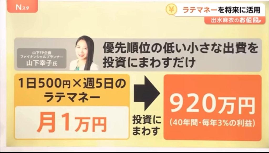 ファイナンシャルプランナーの山下です。先日、テレビ番組「Nスタ」の特集にて、日々の小さな出費が将来の資産に与える影響、いわゆる「ラテマネー」について監修を務めさせていただきました。物価の上昇や将来への漠然とした不安から、資産形成への関心が高まる今、このテーマは非常に重要です。
